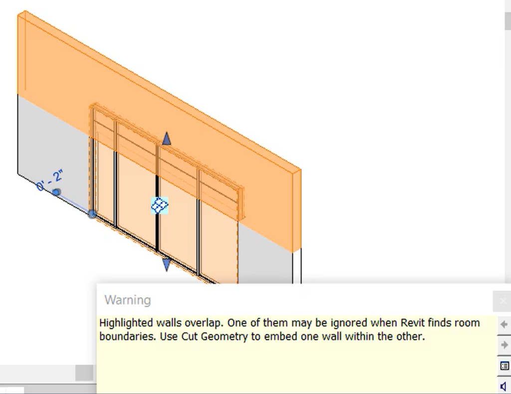 In the accompanying image, when you use the top shape handle to change the height of the curtain wall, what is the most likely reason Revit has warned that the highlighted walls overlap?