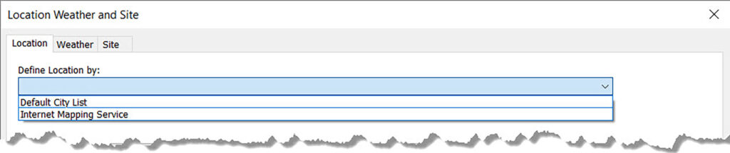 When defining a project location, which option as shown in the image uses actual weather data from a weather station?